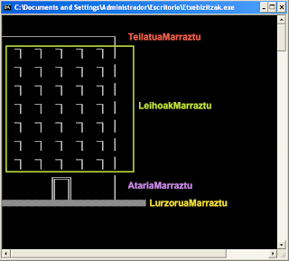 Programa honetan karaktere bereziak erabiltzen dira, karaktere grafikoak. Ikusi ere programa zatika egiten dela, hots, badirela zenbait prozedura gauza jakinak egiten dituztela. Programa bat modulutan banatzen laster ikasiko dugu, orain karaktere berezietan arreta jarri eta identifikatu prozedura bakoitzak zer egiten duen eta nola egiten duen.