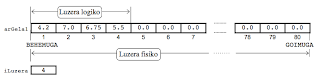 DEFINIZIOA Arrayak dituen elementuak mota berekoak dira eta indize-zerrenda baten bitartez identifikatzen dira, arrayaren elementu kopurua finitua da eta memoriaren gelasketan biltegitzean hurrenez hurren kokatzen dira. Array batek ez ditu indizeak aurredefiniturik eta erabiltzaileak erabakiko du hori (sarri askotan arrayaren lehen indizea 1 izaten da). |
