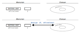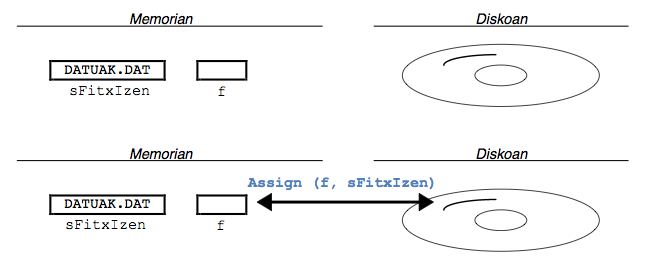 DM_Fitxategi = FILE OF REAL ;VAR Diskoan dagoen informazioa atzitu ahal izateko sFitxIzen aldagaia erabiliko dugu eta fitxategiarekin lan egiteko f aldagaia (FILE datu-motatakoa) beharko dugu. Aldagai biak, noski, konputagailuaren memorian kokatzen dira. Baina konputagailuaren memorian ez dira kokatzen diskoan dauden fitxategiaren datuak. Diskoan kokaturik dagoen egiturari fitxategi fisiko esango diogu. Adibidez, zenbaki errealak biltzen dituen DATUAK.DAT izeneko egiturari fitxategi fisiko esaten diogu eta hona hemen bere balizko eskema bat: Fitxategi logikoa adierazten duen f aldagaia eta diskoan dagoen fitxategi fisikoa elkar uztartzeko Assign prozedura daukagu, eta elkarketa egiteko fitxategi fisikoaren izenaren bitartez lortzen da, STRING baten bitartez alegia. Ikusi eskema hauetan Assign(f,'DATUAK.DAT') prozedura aplikatu aurreko eta ondorengo egoerak: |