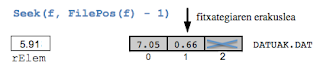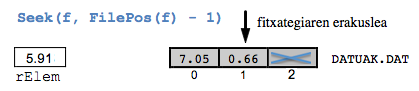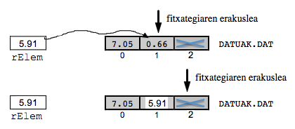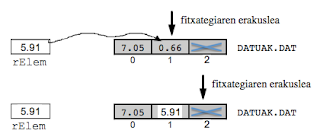 OINARRIZKO ERAGIKETA: FITXATEGIAN IDATZI Memorian dagoen datu bat diskoan gordetzeko, idazketa bat egin beharko da diskoan. Demagun lehen bezala, f aldagaia daukagula uztartu egin duguna 'DATUAK.DAT' izena duen diskoko fitxategiarekin. Memorian aurkitzen den rElem aldagaian datua dago. Honela idazten da datu hori fitxategi batean, lehen bezala f aldagaiaren bitartez: Write (f, rElem) ;Memorian dagoen rElem aldagaiaren edukia fitxategian idatzi. Ikusi eskema: Hasieran, fitxategia hutsik egon da (fitxategiaren erakusle 0 posizioan dagoelako). Idazketa burutu ondoren, datu berri bat dago fitxategian eta erakusleak aurrera egiten du 1 posizioan kokatuz. rElem aldagaiaren edukia berriztuz eta bigarren idazketa bat eginez gero, egoera honako hau izango litzateke, ikusten denez fitxategia luzatu egiten da elementu berri bat daukalako: Baina hirugarren idazketa bat egin aurretik fitxategiaren erakuslea tokiz aldatzen badugu (horretarako Seek erabili behar da), adibidez dagoen tokitik bat atzera egin dezala erakusleak, orduan idazketaren emaitza bestelakoa da. Izan ere, fitxategiaren elementua ordezkatzen du fitxategia luzatu gabe. Beraz, hau da erakuslea posizio bat atzeratzeko agindua Seek(f, FilePos(f)-1) eta idazketa burutzean irudia honelakoak izango lirateke: Ikusten da rElem aldagaiaren edukia berria 5.91 dela eta erakusleak posizio bat atzera egin duela, idazketa burutu ondoren elementu berriak zaharra ordezkatu du, erakusleak aurrera egin du, eta, fitxategiaren luzera ez da aldatu. |