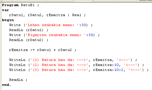 BatuBi programa idatzi. Suposa dezagun bi zenbaki teklatuaren bitartez irakurri ditugula eta batura kalkulatu ondoren pantailan idatzi behar dugula. Zenbaki osoekin lan egin ondoren, jauzi egin dezagun zenbaki errealekin lan egitera.