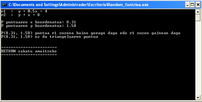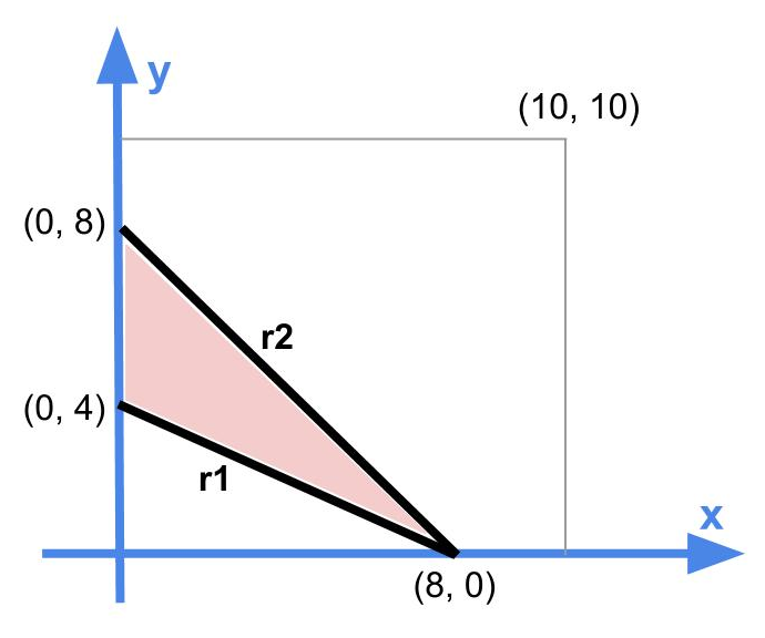 Ondoko irudian triangelu bat definitzen da r1, r2 eta OY ardatzaren artean. P puntu bat lortu aleatorioki (0, 0) eta (10, 10) esparruan dagoena eta zehaztu triangelukoa den ala ez. Puntu bat triangelukoa izateko triangeluaren barnean edo perimetroan egongo da.