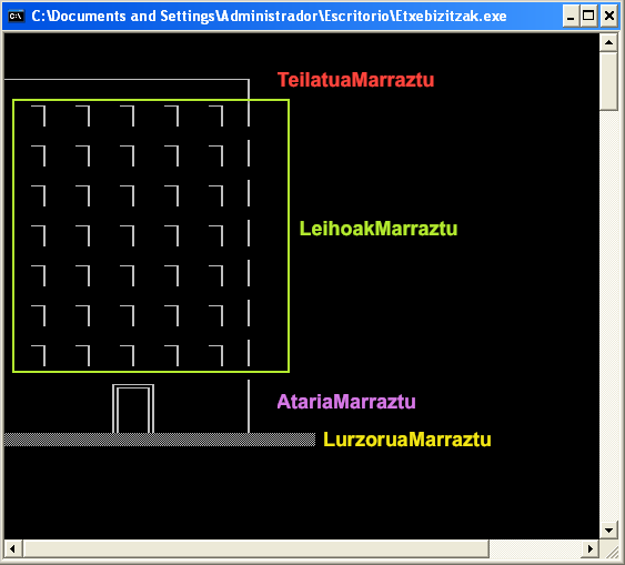 Programa honetan karaktere bereziak erabiltzen dira, karaktere grafikoak. Ikusi ere programa zatika egiten dela, hots, badirela zenbait prozedura gauza jakinak egiten dituztela. Programa bat modulutan banatzen laster ikasiko dugu, orain karaktere berezietan arreta jarri eta identifikatu prozedura bakoitzak zer egiten duen eta nola egiten duen.
