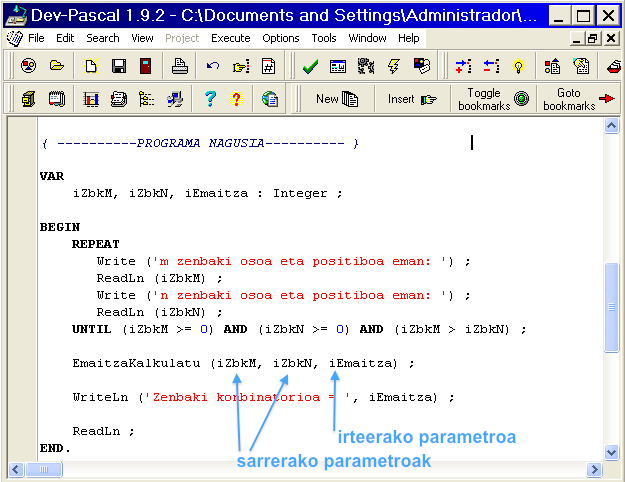 - EmaitzaKalkulatu() prozedura, Integer datu-motako bi sarrera eta irteera bakarra LongInt datu-motakoa (LongInt datu-mota Integer antzekoa da)