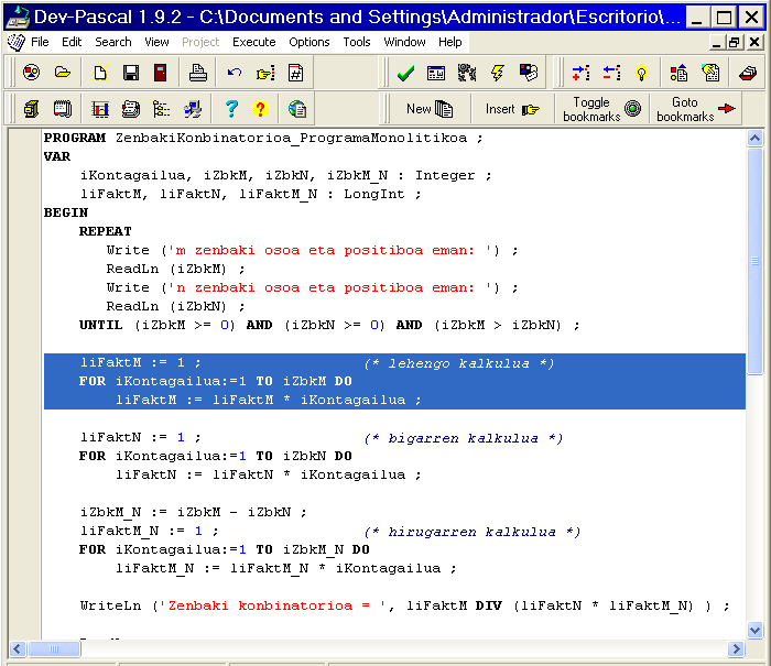 Ondoko programa honek ZenbakiKonbinatorioaMonolitikoa.PAS zenbaki konbinatorioa kalkulatzen du, baina aintzat hartu programak inolako barne antolaketarik ez duelako faktorialaren kalkulua hiru aldiz egiten duela:
