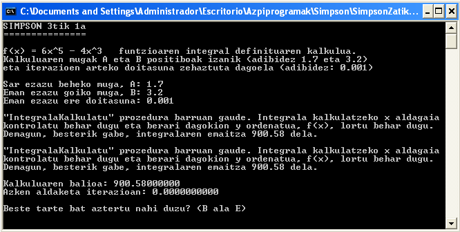 Jarraian eskaintzen den programan ikus daiteke bere programa nagusia eta bere menpekoa den IntegralaKalkulatu prozedura. Prozedura honek 4 parametro ditu: