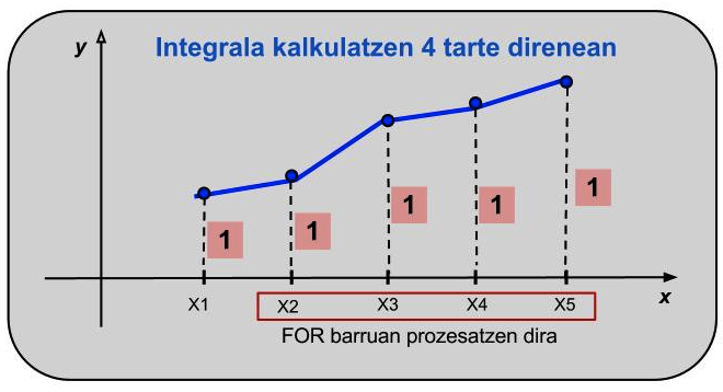 Irudi honetan erakusten da nola kontrolatzen diren x ardatzeko puntuak IntegralaKalkulatu prozedura barruan. Lehena FOR kanpoan prozesatzen da eta gainerakoak FOR barruan prozesatzen dira. Puntu guztientzat y = f(x) ordenatuak lortzen dira eta ez denez koefizienterik aintzat hartzen bakoitzaren koefizientea 1 da.