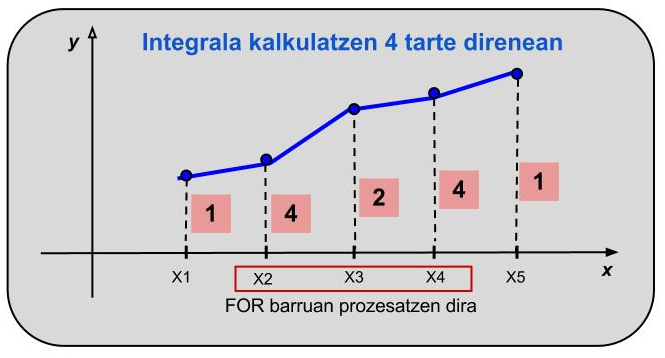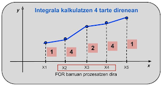 Irudi honetan erakusten da nola kontrolatzen diren x ardatzeko puntuak IntegralaKalkulatu prozedura barruan. Lehena eta azkena FOR kanpoan prozesatzen dira eta gainerakoak FOR barruan prozesatzen dira.