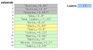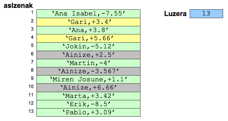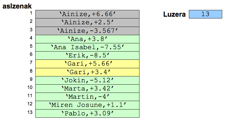 Arraya ordenatu egin behar da, lehenik izenen arabera, alfabetikoki A-tik Z-ra. Izenak berdinak direnean zenbaki handitik txikirako ordenazioa gauzatuko da. Aurreko adibidearekin jarraituz, emaitza hau izango litzateke:
