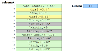 Laborategiko gela batean, gehienez, 25 ikasle izango dira. Ikasleen datuak array batean biltzen dira eta datuak teklatuaren bitartez ematen dira. Arrayaren elementuak kateak dira, eta bertan izena eta zenbaki bat koma batez banaturik daude, honela adibidez:
